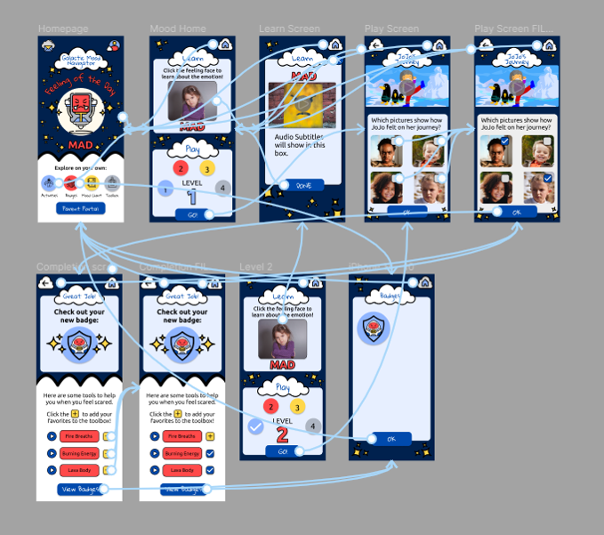 My high-fidelity prototype took the user through the experience of viewing the emotion of the day, learning about the emotion, and engaging in an activity to apply the knowledge. They were then able to add a new tool to their toolbox and could view their badges.